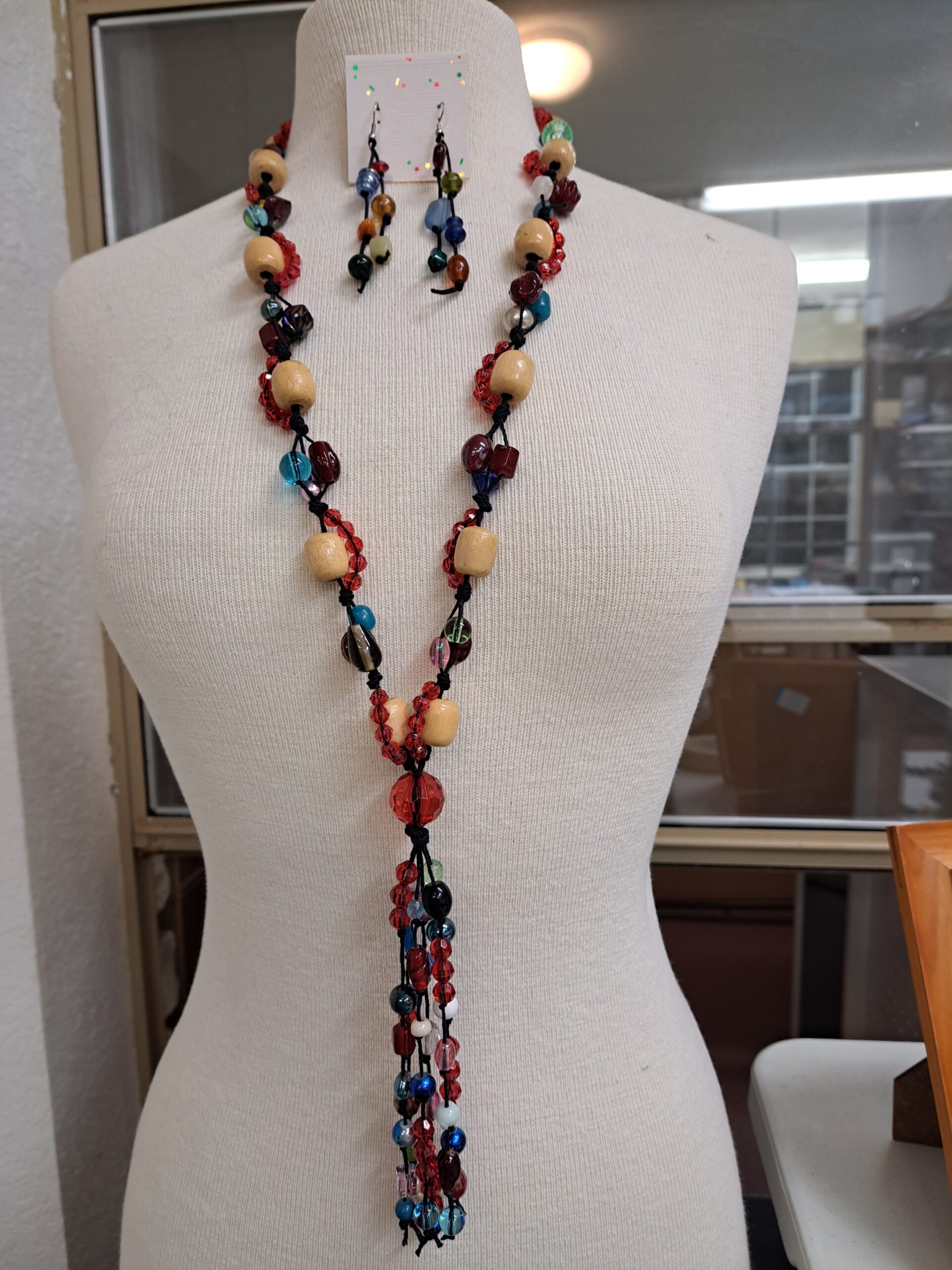 And finally, the “Y” necklace is a “V” with a tail, just like in the letter. Bead pattern is important in this style. 42-44 inches is a nice finished length, including the tail, but being tall, I prefer about 48”. You generally need 7-9 large beads with some supporting smaller beads around and between them and both sides usually need to be the same. When you get to the 7th or 9th large bead, you run both sides of the wire through one large bead and the surrounding smaller beads in your pattern and then bead the wires hanging down to create the tail. Check the size of the holes in the beads before you get to this part to be sure your 2 wires (or more in some patterns) will go through all of them. A bead reamer can enlarge the holes in many beads, but not always. You can make this necklace with or without a clasp. It can be made with one or multiple strands. You need to put crimps on the wire about half way down the pattern on each side, just before you come to the place where you run both sides through the same beads, and at the end of each strand of the tail. Also, before you bring your two sides together through one set of beads, and as you begin your tail, you’ll need to use a couple of seed beads or other very small beads on your wires so they will feed in and out evenly and not throw your pattern off.